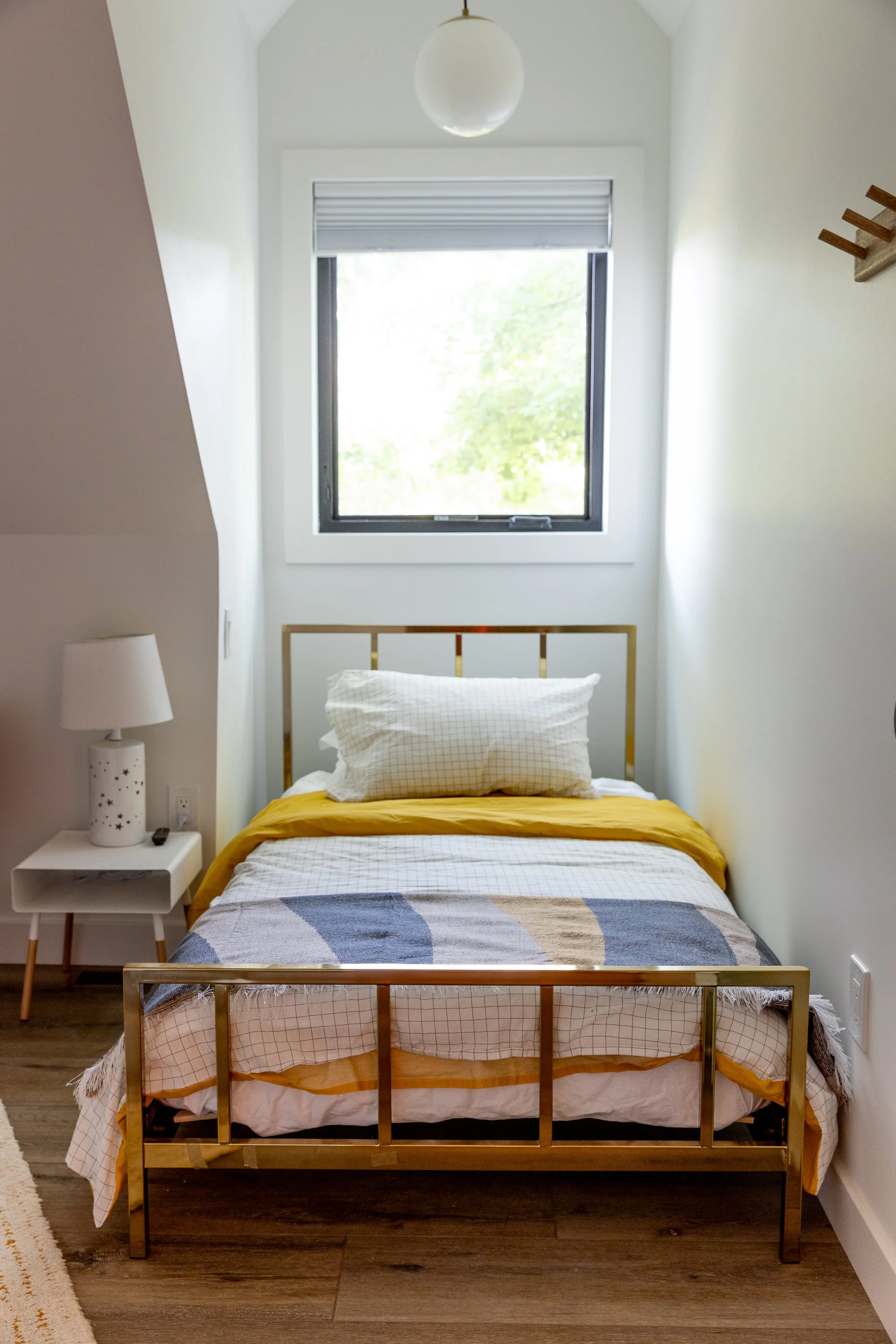 This bright room with queen bed on the main level is steps away from the bold designer bath with walk-in tiled shower.